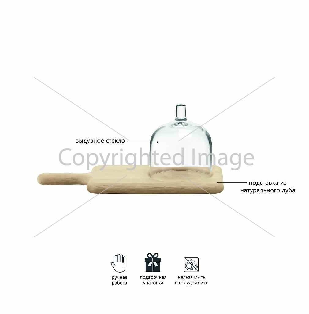 "Набор из доски с крышкой подойдет для сервировки сыров, крекеров и других легких закусок для уютного семейного обеда, домашней вечеринки или романтических свиданий. Крышка из выдувного стекла закрывает часть доски ручной работы, выполненной из натурального дуба. Набор упакован в красивую коробку и его можно захватить с собой на домашнюю вечеринку для хозяина(,-ки), или подарить на особую дату друзьям.