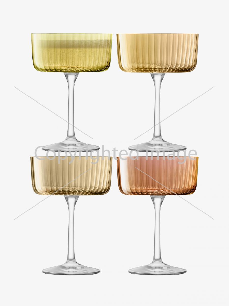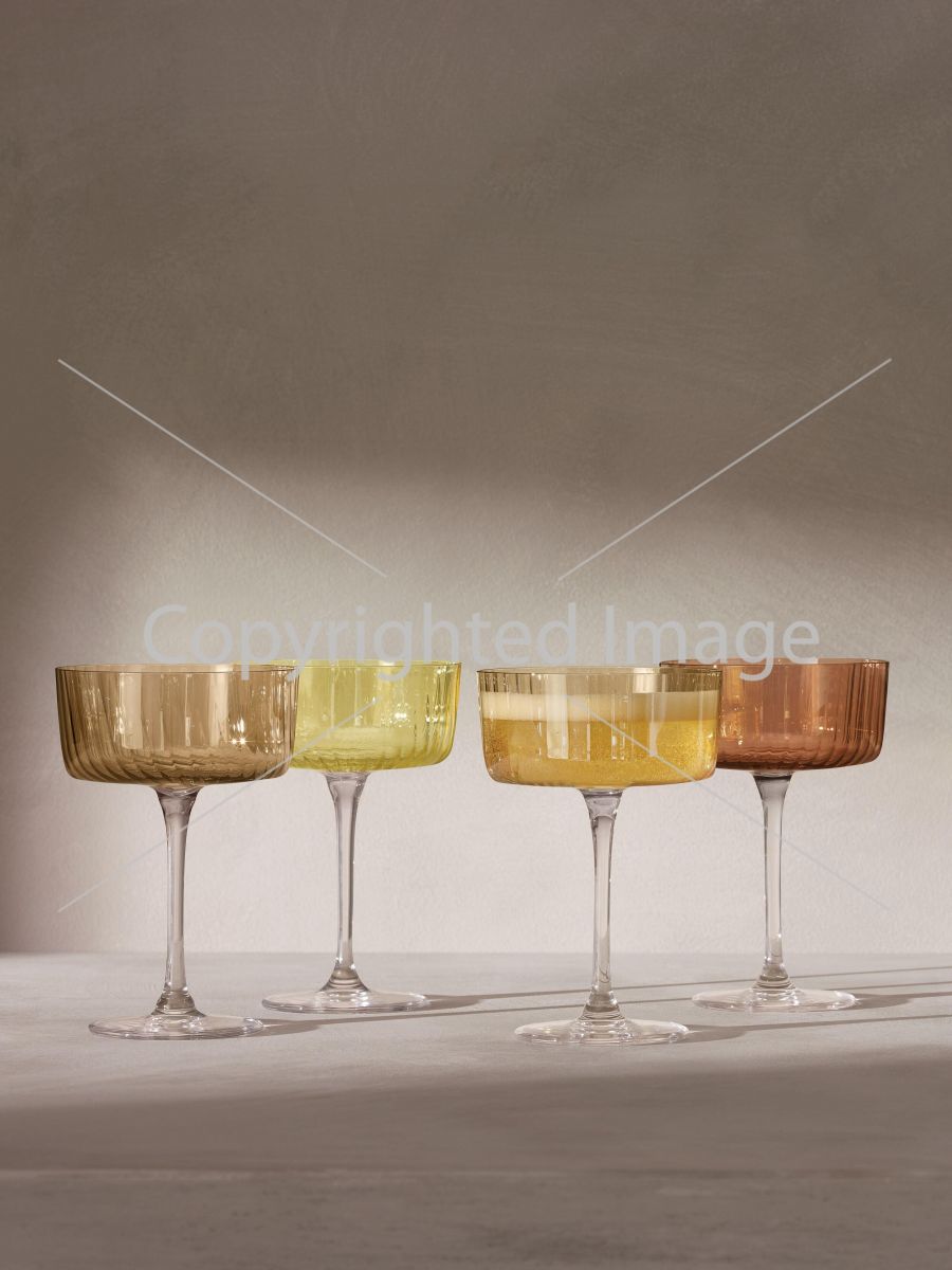 Набор текстурированных бокалов для коктейлей с небрежными ножками и тонкими стенками, вручную окрашенных в различные янтарные тона. Для подачи просекко, шампанского или коктейлей.