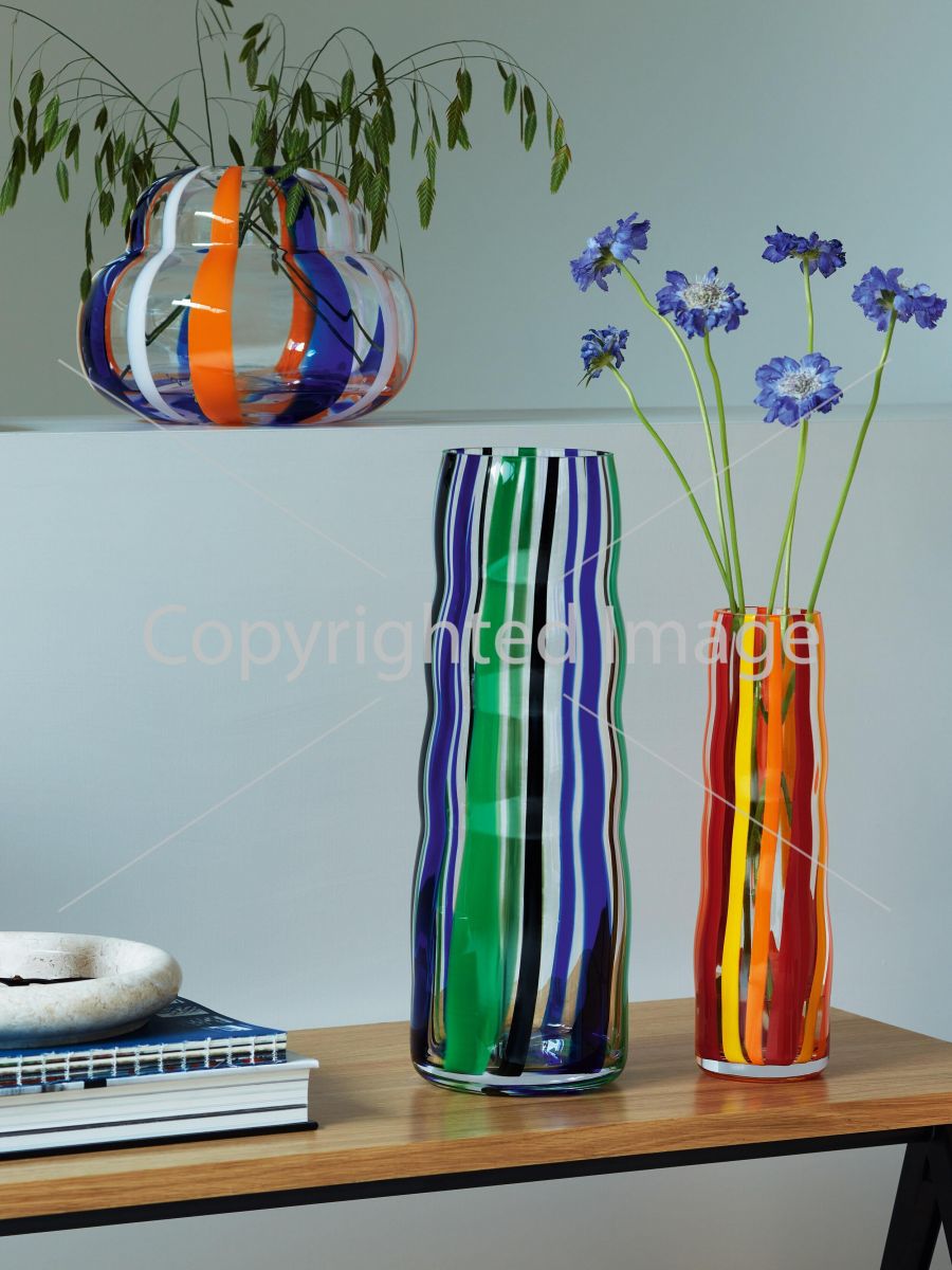 Высокая и узкая ваза с выдувным ртом и характерным узором в народном стиле и волнообразным силуэтом. Для сезонных ветвей и более длинных стеблей, таких как гладиолусы.