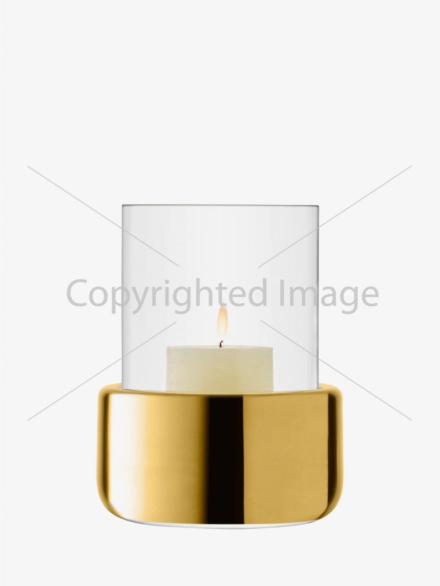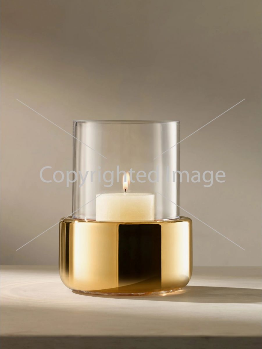 Ваза из выдувного стекла, которая воспроизводит теплые, отражающие свойства драгоценного золота. Цилиндрическая форма расписана вручную полосой из настоящего золота, которая тонко подчеркивает ступенчатый силуэт. Подходит для использования в качестве фонаря или вазы и поставляется с текстурированной свечой без запаха.