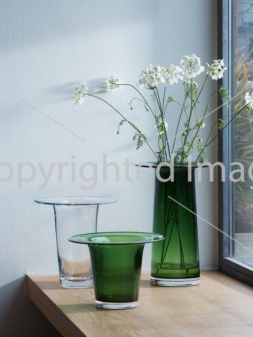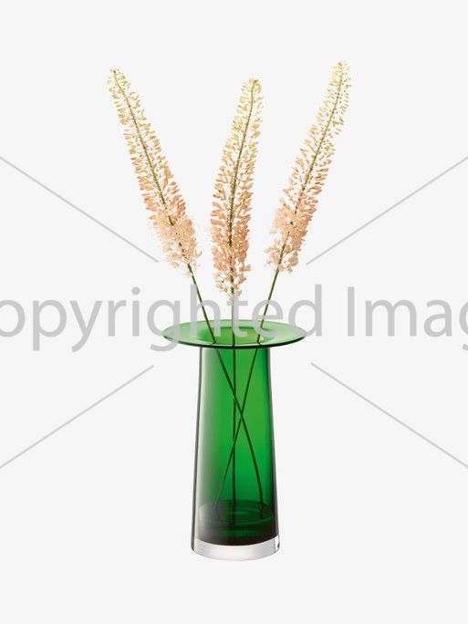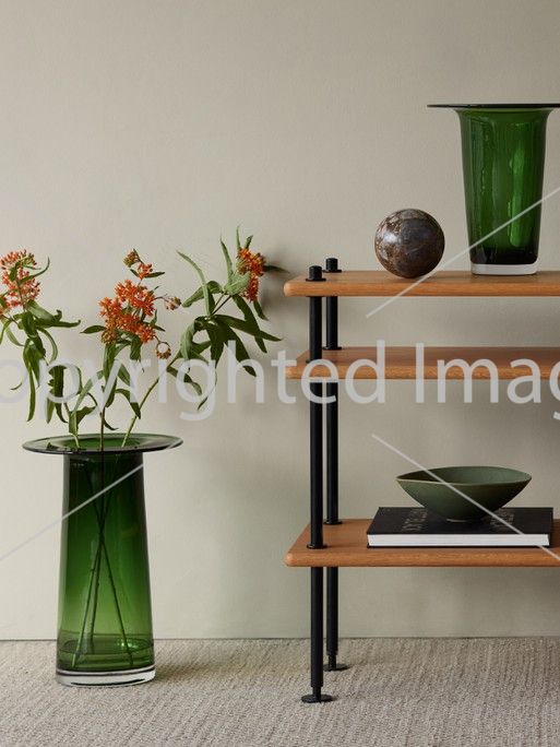 Большая выдувная ваза из папоротниково-зеленого стекла с толстыми стенками, которые вверху загибаются наружу, образуя широкие и плоские края. Предназначена для центральных дисплеев и эффектных цветочных композиций.